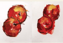 One major visual difference between the two types of paints is how light comes back to your eye from the painting surface. With opaque paints, the light hits the surface of the paint and bounces back to your eye. Transparent paints operate more like a sheer veil of color. The light will hit the paint and since it’s transparent, will penetrate through to the ground (whether white watercolor paper or a white canvas) and will bounce back thru the transparent paint and back to your eye. In this way, it is like backlighting, which gives transparent paints their luminosity and glow.